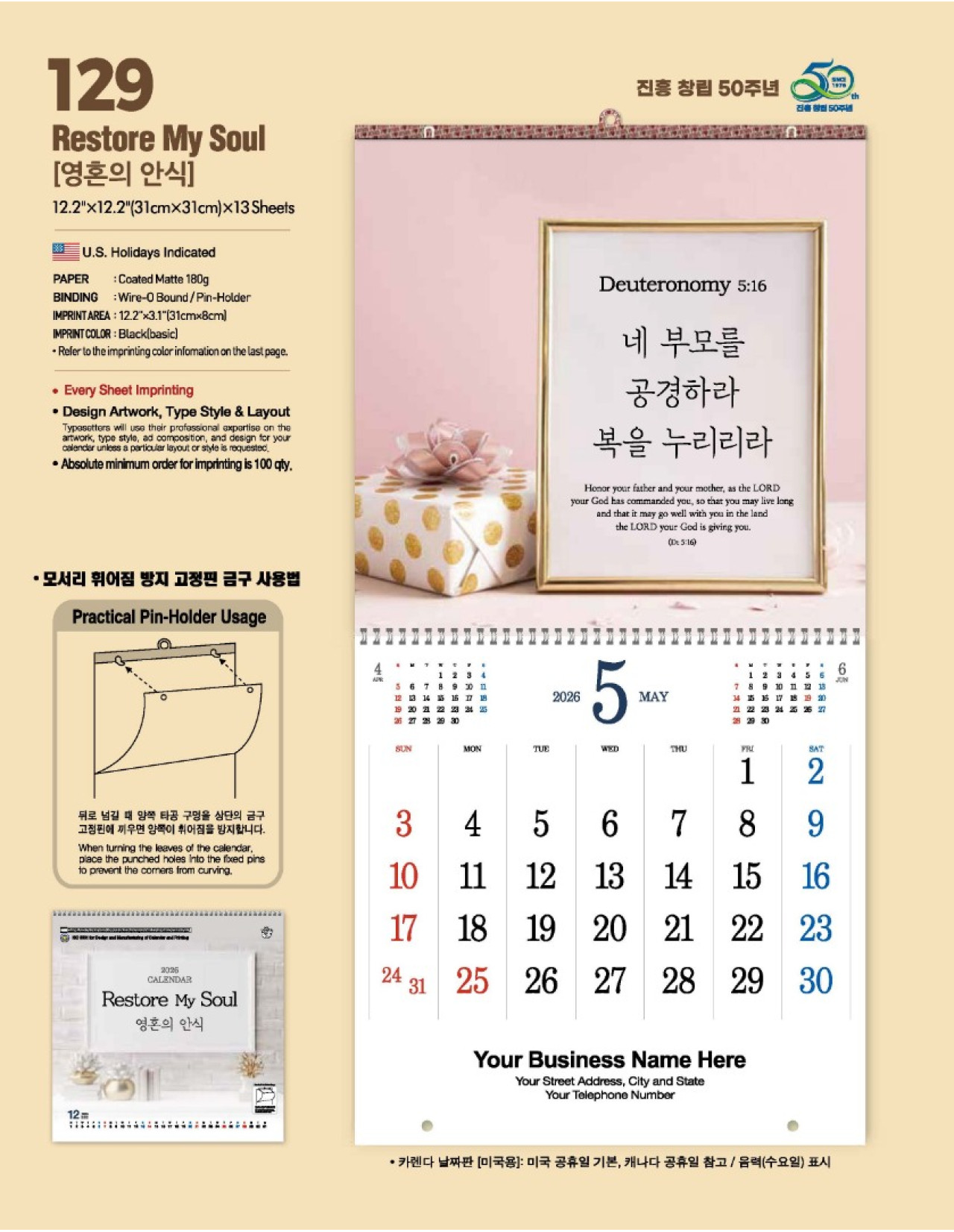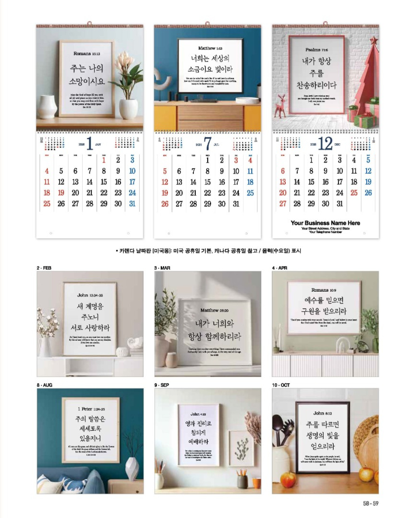 • 교회명 인쇄는 100부 이상 오더하시면 무료이고, 100부 미만인 경우에는 벽걸이 캘린더 $20.00, 탁상용 캘린더 $30.00의 인쇄 판비 제작비용이 추가됩니다.