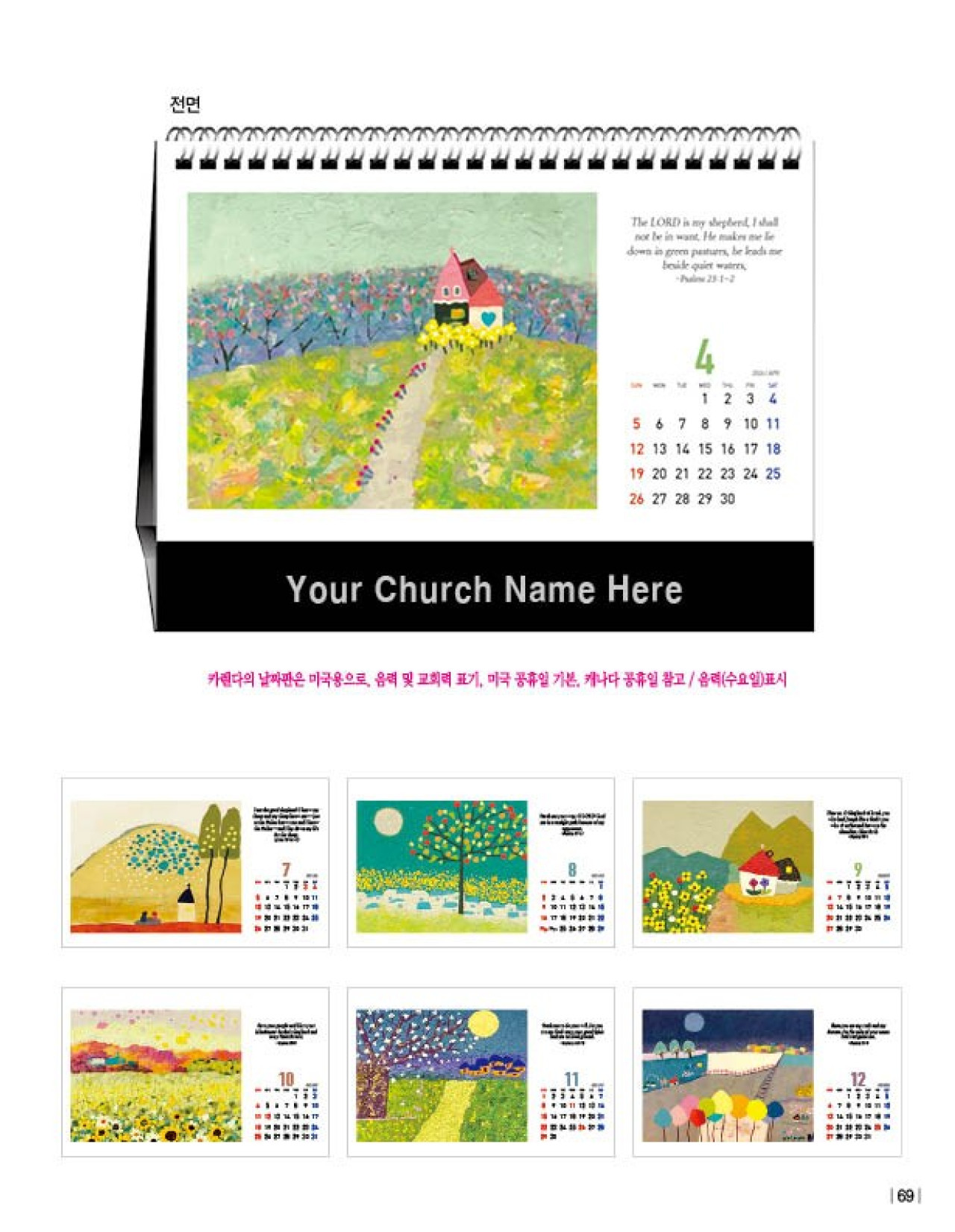 • 주문하시는 캘린더는 하단에 교회 안내 등을 삽입하여 주문/ 제작됩니다. 따라서 아트웍 승인 이전에는 주문을 취소 하실 수 있으나, 승인 이후에는 취소 불가능합니다.