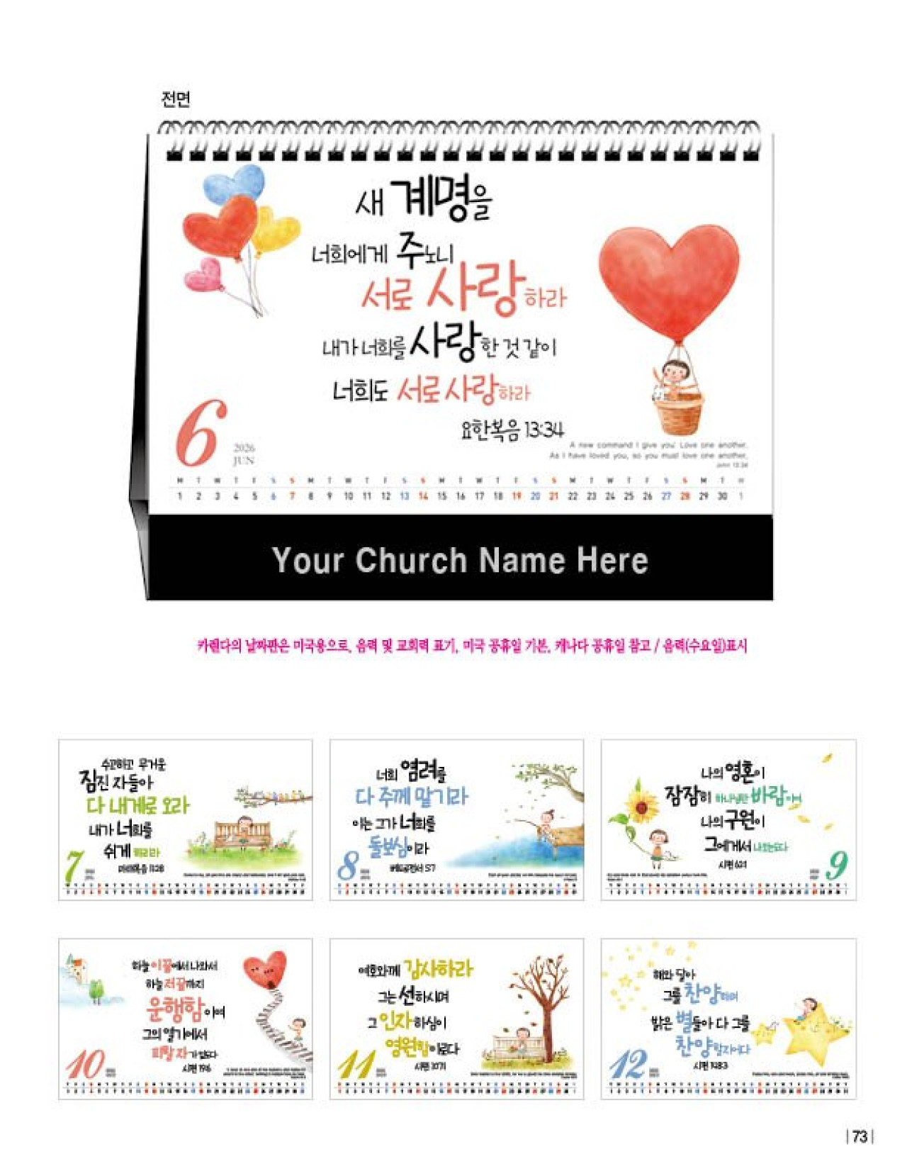 - 교회명 인쇄는 100부 이상 오더하시면 무료이고, 100부 미만인 경우에는 벽걸이 캘린더 $20.00, 탁상용 캘린더 $30.00의 인쇄 판비 제작비용이 추가됩니다.